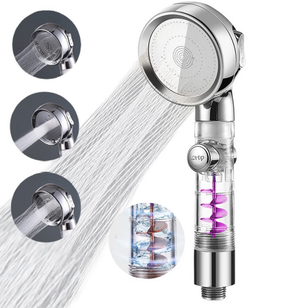 3-Mode Shower Head™ har et innebygd roterende hjul for å generere en vannstrøm under trykk, noe som øker strømningshastigheten til vannet, og dermed øker vanntrykket. Det unike vannmønsteret letter huden, fremmer bedre blodsirkulasjon og slapper av musklene. Få massasje og dusj på samme tid!
