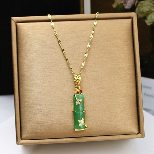 Jade Bamboo Necklace™ er et kunstverk modellert av ekte bambus. Nåden til jadeperlen på toppen av den supplerer den naturlige følelsen av bambusdesignet - og gir en frisk stemning og stil. Det som gjør den enda mer nydelig er den estetiske gullkjeden som holder anhenget.