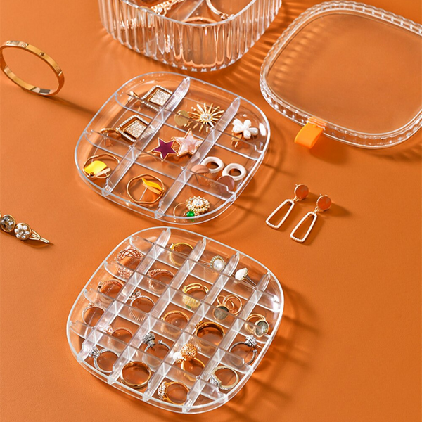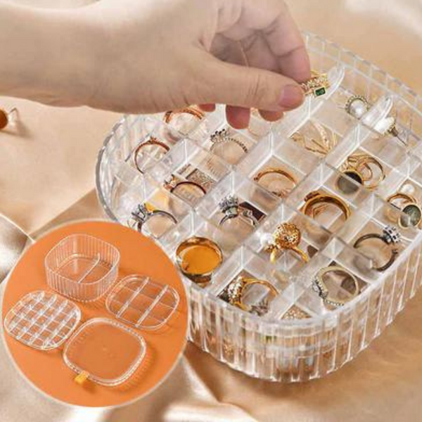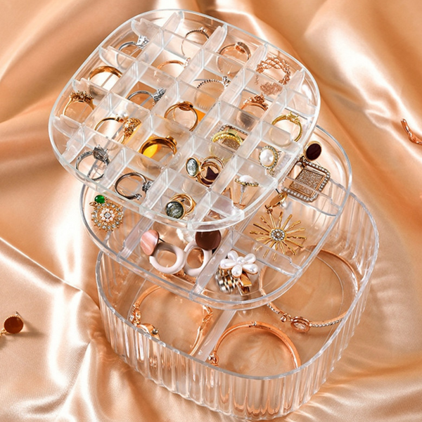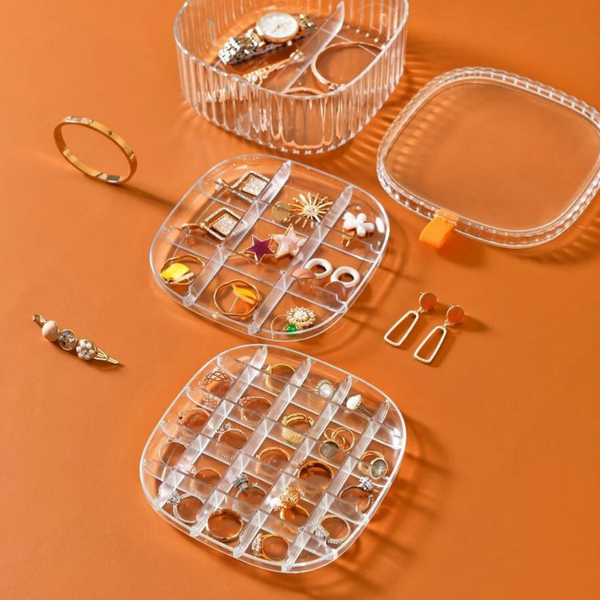 Vil du lagre dine dyrebare smykker i en multifunksjonell og stilig oppbevaringsboks? Ha tilbehøret ditt organisert i flerlags Jewelry Box™! Denne gjennomsiktige oppbevaringsboksen av høy kvalitet lar deg finne dine favorittøreringer, halskjeder, mansjettknapper og mer!