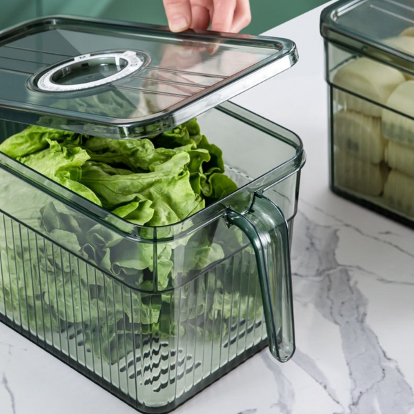 Vil du holde maten ferskere i kjøleskapet lenger? Oppbevar dem i vår Produce Saver Container™ slik at de holder seg ferske! Med sitt lufttette lokk, funksjonelle ventiler og avløp som fremmer bedre luftstrøm, kan du være sikker på at maten varer lenger!