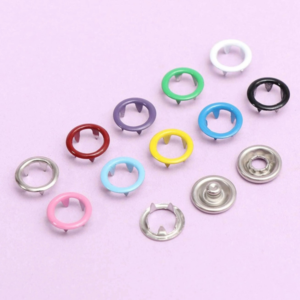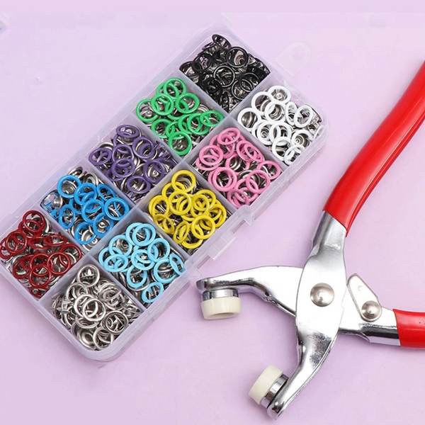 Med hver bestilling av Snap Button Kit™ får du et festeverktøy og et komplett sett med topp- og bunnlåser i metall. Du får også 10 sett med fargede låser som du kan bruke til å oppgradere eller reparere garderoben din!
